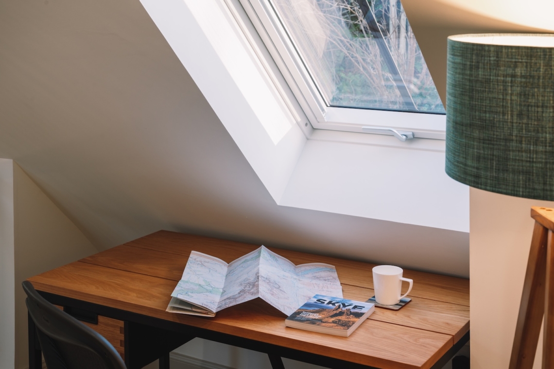 As you ascend the bespoke oak staircase, you’ll find the desk/working station with stunning views over the picturesque loch and to the hills behind. There’s high-speed broadband if you need to work or just catch up with e-mails. The desk provides an area for planning routes for the next day and making the most of your stay in the area.