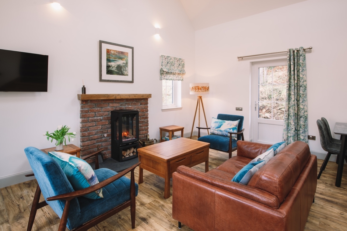 The entrance to the cottage welcomes you with an ample sitting space with spectacular views of sea and hills. As you venture further in, the open plan living-kitchen space unfolds, inviting you to relax and unwind. Embrace the comfort of our sitting room, with its handmade fireplace, the bricks are sourced from a Victorian walled garden and the mantlepiece is a repurposed oak beam.