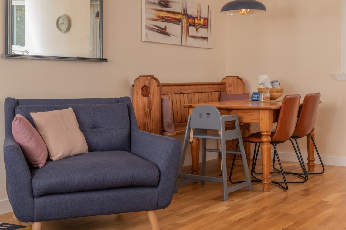 Inside, you’ll find a warm and welcoming open-plan living space featuring locally made whisky barrel furniture and bespoke Scottish textiles. Whether you’re sipping whisky, watching Netflix from the comfort of the sofa, or preparing a meal with fresh Highland produce in the fully equipped kitchen, every detail has been carefully curated for a memorable stay.