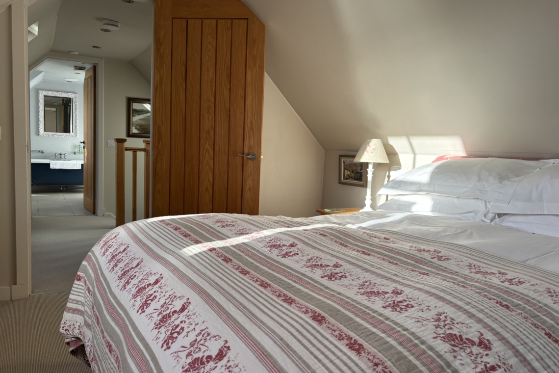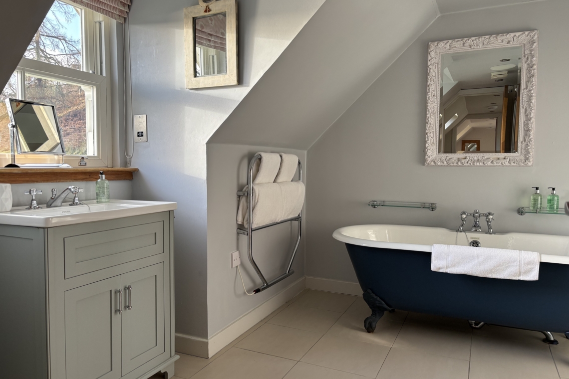 Step upstairs into the bedroom where you’ll find a large king size bed with gorgeously grown up bedding and a super comfy mattress perfect for lazy days and long lie ins, hand crafted by Hypnos manufacturer of “the most comfortable beds in the world”. Head through to the luxury bathroom with its beautifully romantic deep cast iron roll top bath and walk in shower. There are fluffy towels and complimentary Scottish toiletries for your use during your stay.