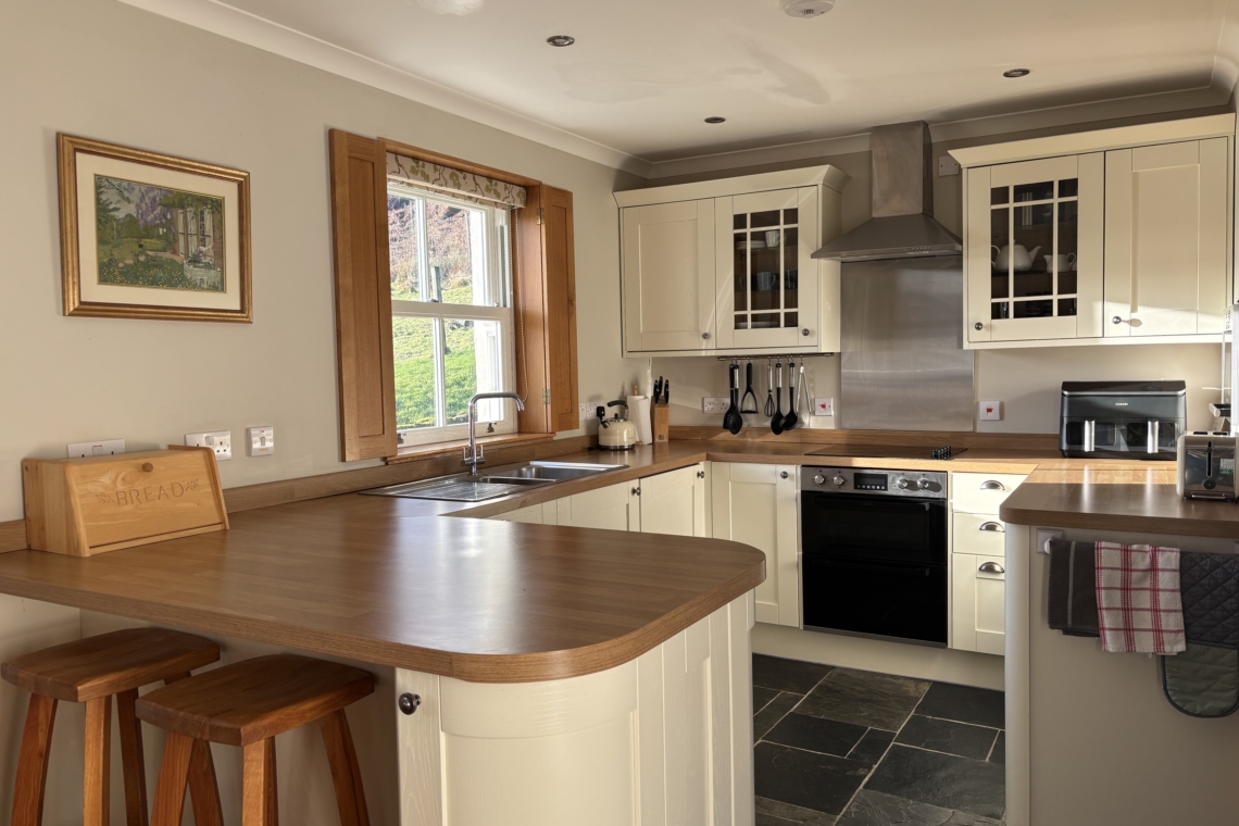 The Cottage itself looks like a traditional Scottish cottage but is recently built and therefore feels modern and wonderfully warm inside whilst maintaining its charm. Ours was a Christmas stay and the modern air-sourced heating system was brilliant – always warm and cosy and easily controlled and plentiful hot water. This was topped off with a brilliant wood burning stove with plenty of dry logs. The open plan downstairs living area is lovely, with a large TV that has access to Netflix and Freeview Play and even larger view to the Loch! The kitchen is a great size, well laid out with modern oven, ceramic hobs, microwave, dishwasher and full size freezer and fridge. It is well equipped with good quality pots and pans. To help plan your visit, there was a single kitchen roll and 4 dishwasher tablets; there is no blender/mixer. Upstairs was a large bathroom with beautiful bath and brilliant, very powerful shower! The bedroom had a comfortable kingsize bed with lovely views to the Loch. We didn’t meet the owners, but the communication prior to arrival was top notch providing all the information we required. As Crosple is so well stocked we didn’t need their assistance during our stay but I have no doubt they would have been very helpful if required. This really is a wonderful place to stay, we will be back!”