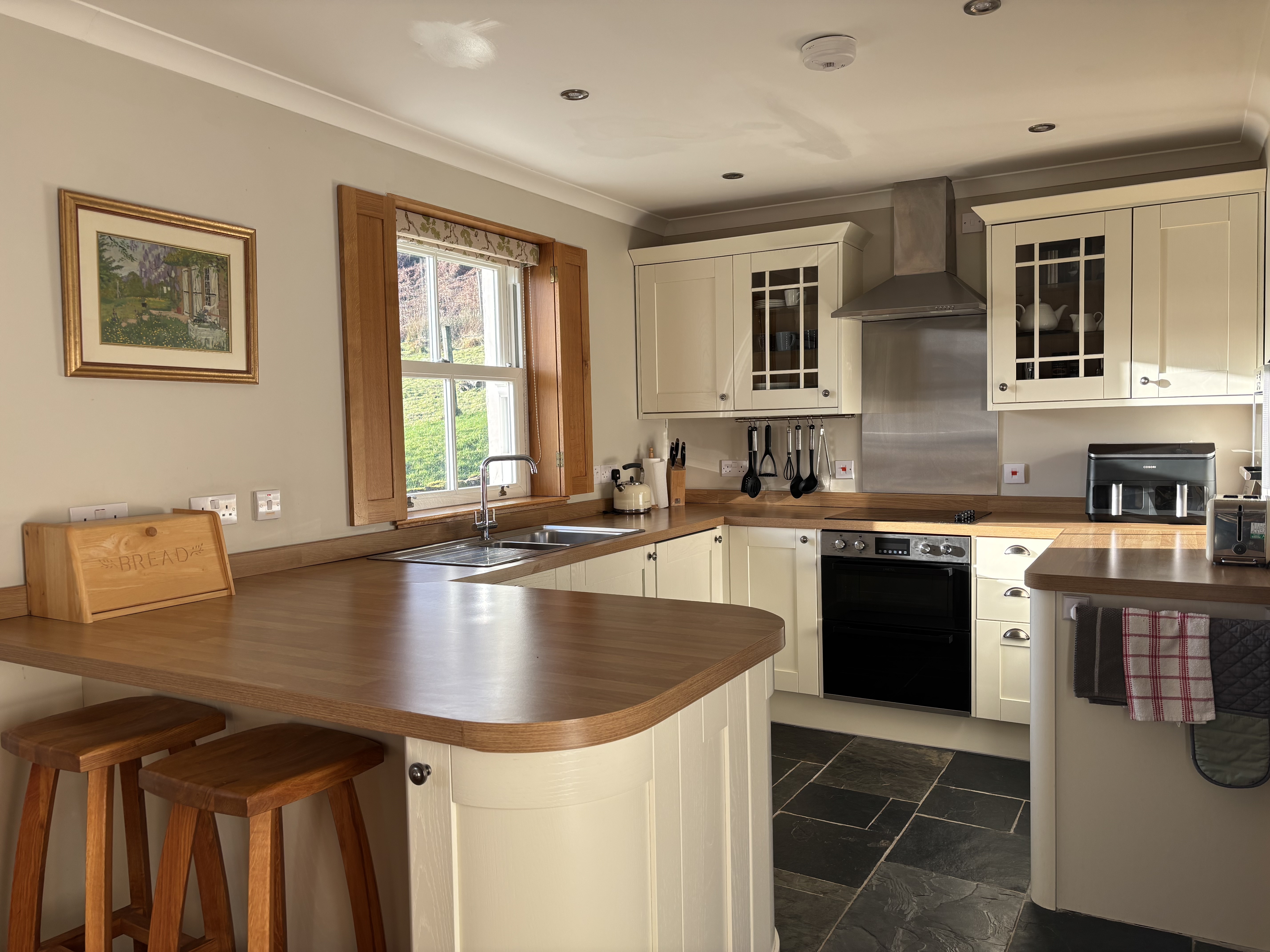 The house has a well-equipped kitchen with induction hob, electric cooker, an air fryer, microwave, dishwasher, fridge/freezer, washing machine and tumble dryer.
