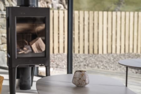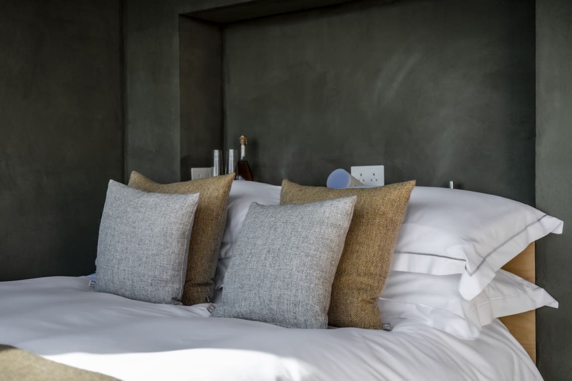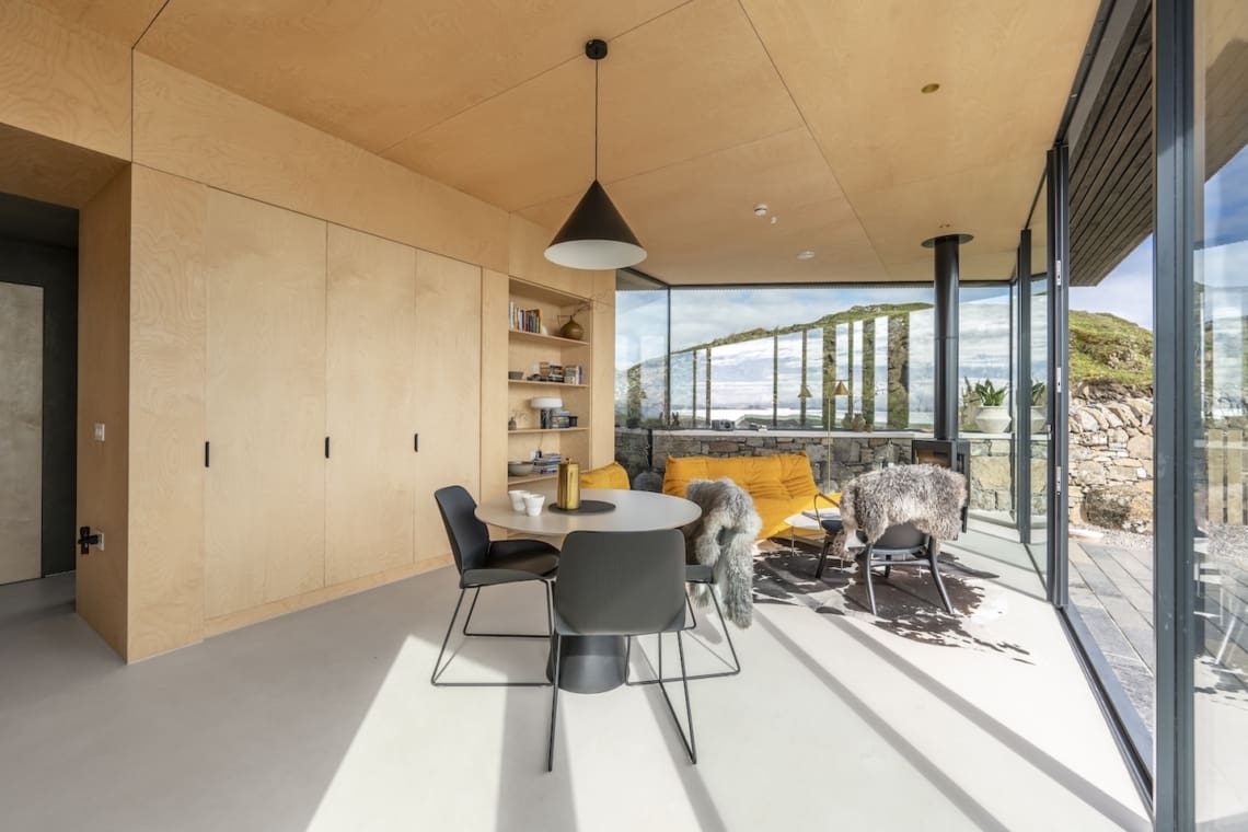 Step inside the open-plan living area and be mesmerised by the panoramic vista. Walls of glass seamlessly blend indoors and outdoors, with uninterrupted views stretching towards the majestic Torridon Mountains on Scotland’s West Coast. A log fire adds warmth, while the centrepiece of the space – a meticulously restored ancient dry stane dyke – embodies the magic of bringing the outside in. Here, tranquillity reigns, offering a unique sanctuary for relaxation amidst nature’s embrace.