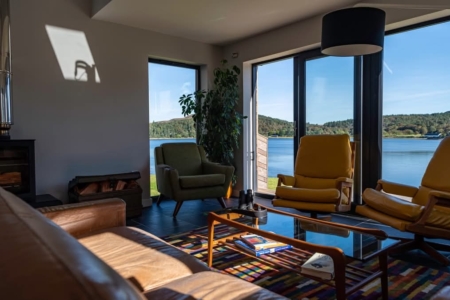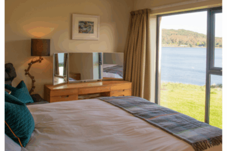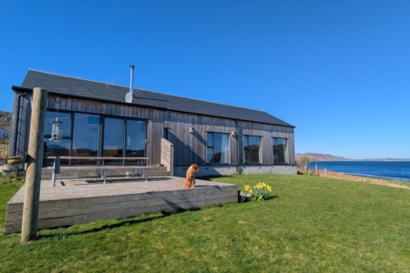 A stunning luxury new-build home situated in the North West Scottish Highlands, right on the shoreline of a sea loch and on the iconic NC 500 route. This beautiful large holiday house sleeps 9 in 4 bedrooms; 2 four-legged family members are also welcome. All on one level, with a ramp up to the front door, the home also is perfect for guests with limited mobility.