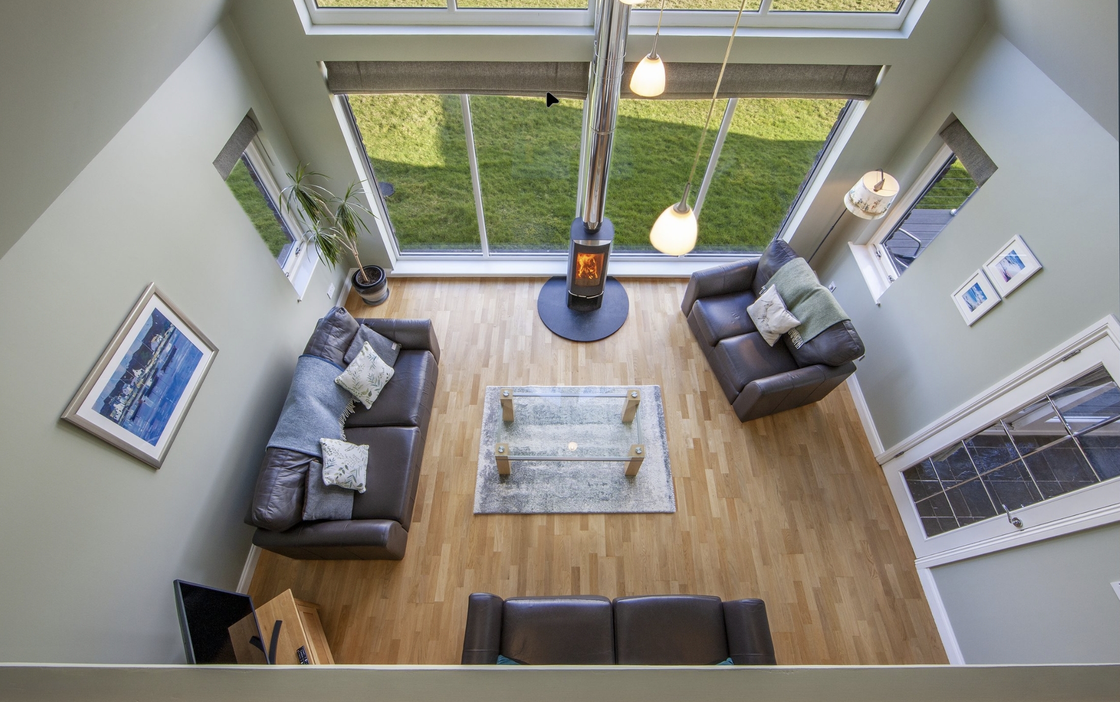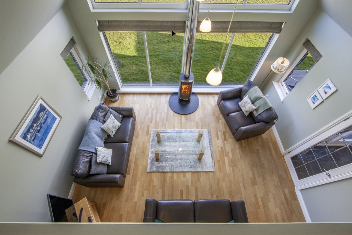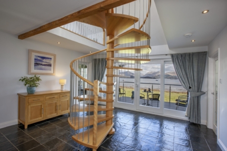 The large double height ceiling in the living room with its uninterrupted views across Loch Creran offer a relaxing area to sit in the evening with large leather sofas by the cosy woodburning stove for family nights in. There’s also a second sun  lounge area perfect for reading or painting with equally breathtaking views to enjoy. Passing through the entrance hall there’s a feature spiral staircase taking you elegantly from ground level to the first floor. Step outside through the patio doors onto morning coffee decking area, or the large grass lawn and you’ll find a gas BBQ and outdoor seating great for entertaining on a summer’s night.