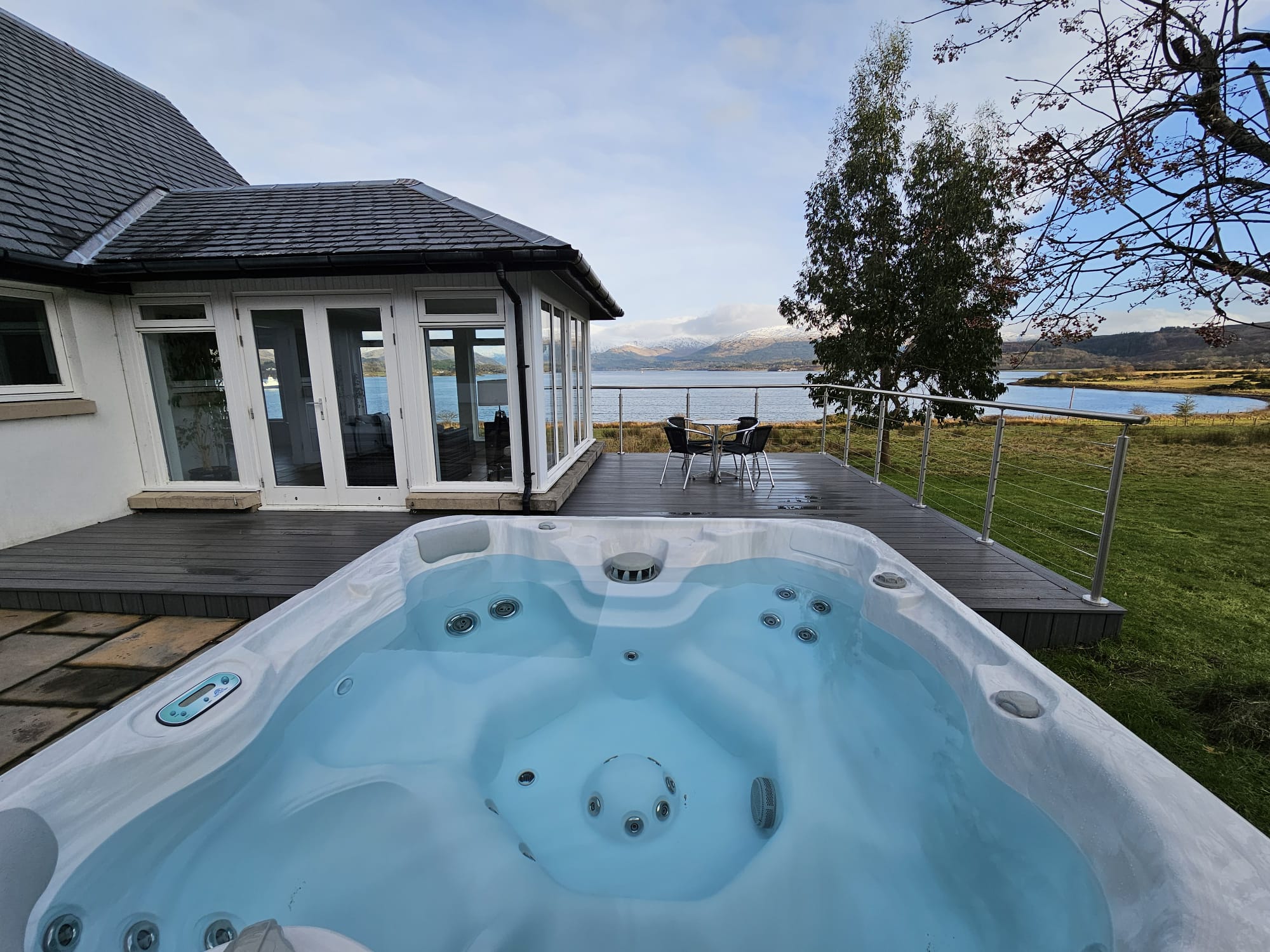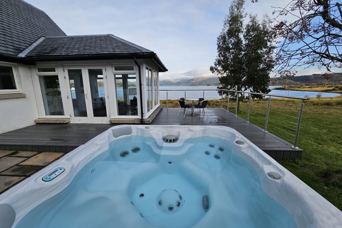 Loch side light filled luxury, on the sparkling shores of Loch Creran, near Oban – Seabank House minutes from the beach with spiralling staircase, large hot tub, stunning views and maximum space for superb family relaxation.