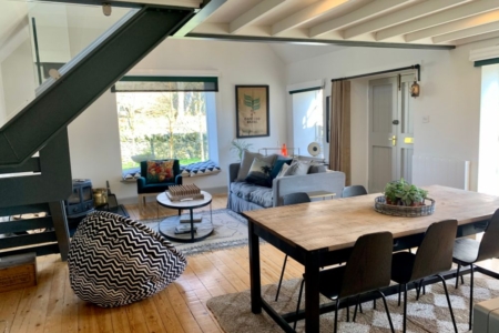 Inside, the open-plan layout flows from a well-equipped kitchen and spacious dining area to a light-filled lounge, complete with a velvet armchair, cocoon chair, window seat and a crackling wood-burning stove the heart of the home in the colder months. Unlimited logs are provided to keep the space toasty and welcoming, no matter the season.