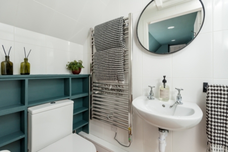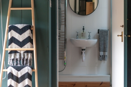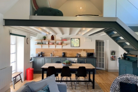 Sleeping arrangements include a cosy twin bedroom in the former pigsty now painted in deep Inchyra Blue and dressed with soft wool blankets and Egyptian cotton linen plus a loft-style mezzanine above the kitchen with a flexible kingsize bed that can be split into twins. The shower room is just off the twin room and includes spa-style Meraki toiletries and fluffy towels for a boutique finish.
