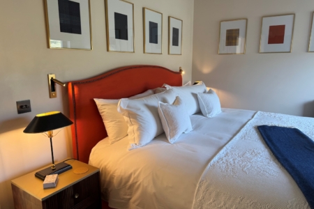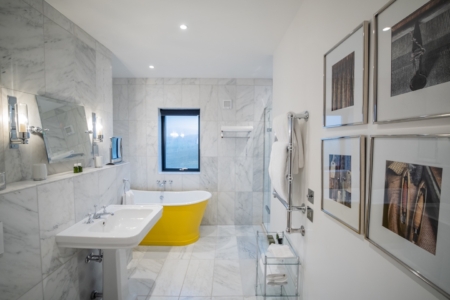 The marble bathroom has a large free-standing bathtub, rainhead shower and laundry cupboard with washing machine and separate dryer. The adjacent bedroom has a super king-sized bed, plenty of wardrobe space and the most comfortable mattress and soft, Egyptian cotton bedlinen to guarantee a restful night’s sleep.
